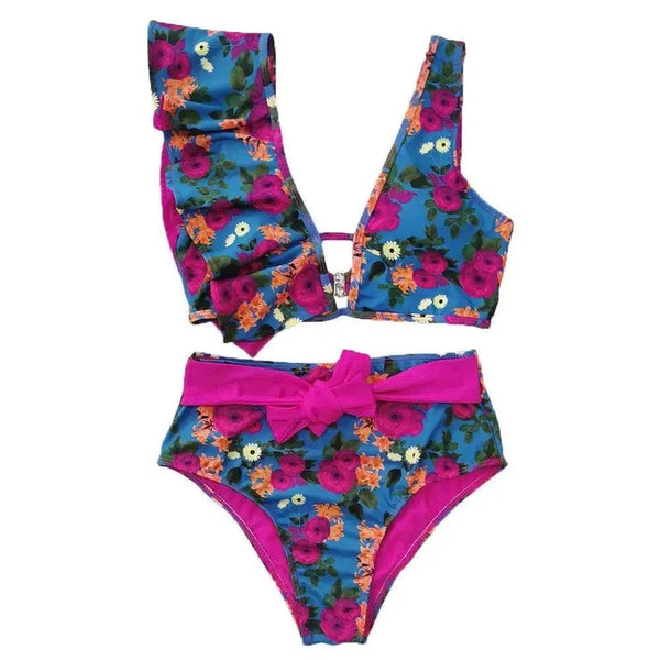 - Style: Asymmetrisk bikini med volanger og høy midje