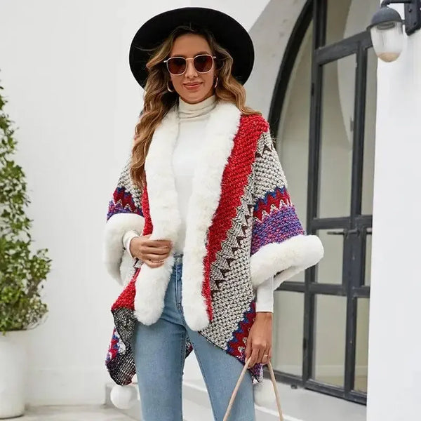 Inverness stripete etnisk stil med pelskrage for kvinner