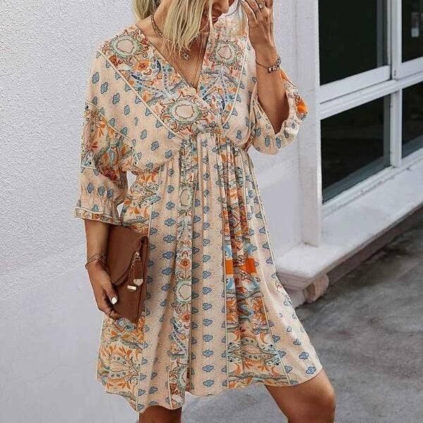 Kjole med V-utskjæring og midjebesetning med trykk på tvers av grensene