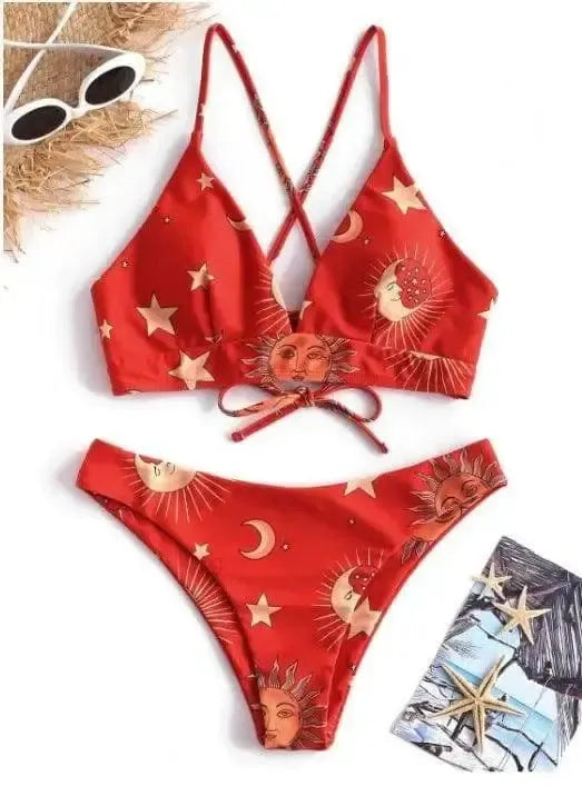 Splitbikini med høy midje med solmåne og stjernetrykk