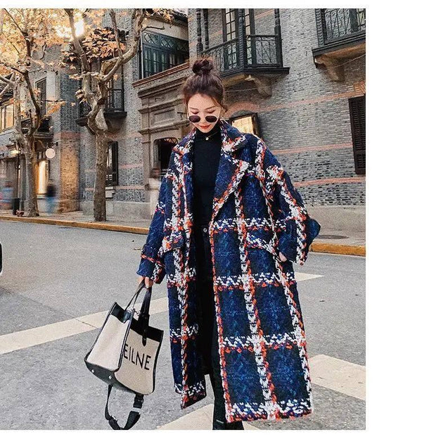 Kontrasterende rutete temperamentdrakt med løs krage, rett
