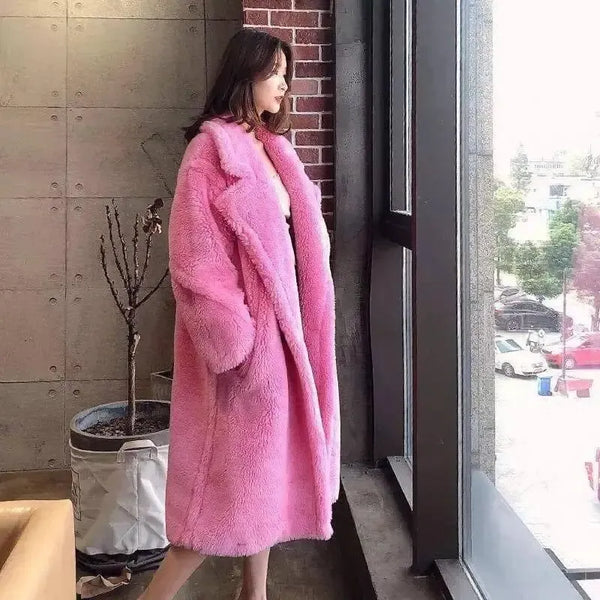 Lang kåpe i pels og lammeull for kvinner