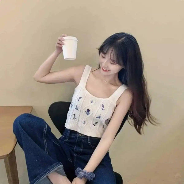 Strikket, blomstrete topp uten ermer, fritidsklær