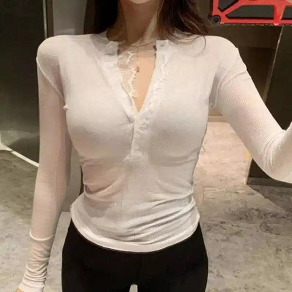 Langermet topp med gjennomsiktig blondekant for kvinner
