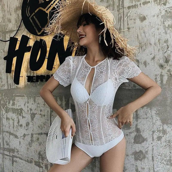 - Stil: Elegant badedrakt i ett stykke med blonder og utskjæringsdetaljer