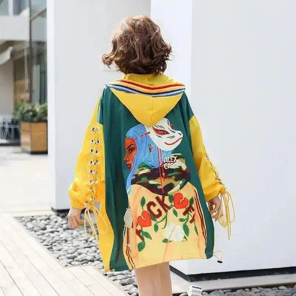 Store elementer: Jakkens bakside har en slående, storskala grafikk med livlige farger og kunstnerisk stil, noe som gjør den til et midtpunkt i designet. Fronten er mer nedtonet, slik at kunstverket på baksiden kan stå i sentrum.