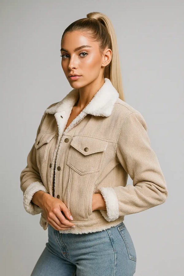 Vattert jakke i lammeskinn i kordfløyel, lang