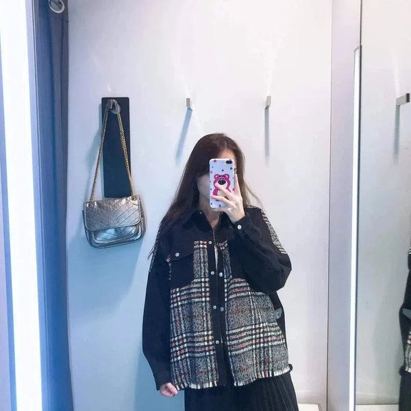 Luksuriøs tekstur og materiale: Denne jakken er laget av en blanding av høy kvalitet og gir en behagelig og myk følelse. Kombinasjonen av ensfarget svart stoff og tweedlignende paneler gir jakken en sofistikert og strukturert design.