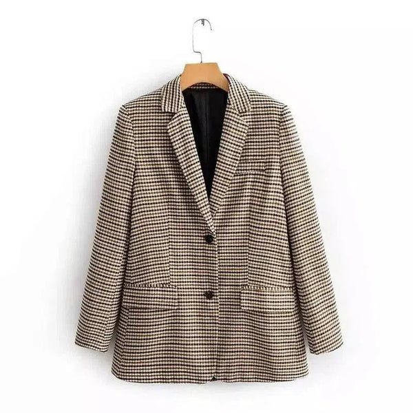 - Classic Houndstooth Blazer: Løft garderoben din med dette tidløse plagget med et tradisjonelt houndstooth-mønster i en nøytral fargepalett.