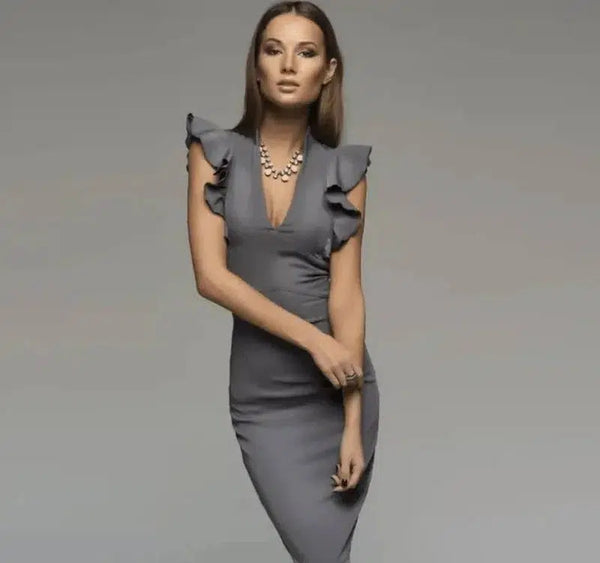 Tettsittende kjole med dyp V-utringning og lotusblad-ermer
