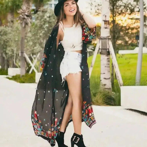 - type plagg Plaggtype: Lang kimono-cardigan med åpen front, matchende crop top og denimshorts med høy midje