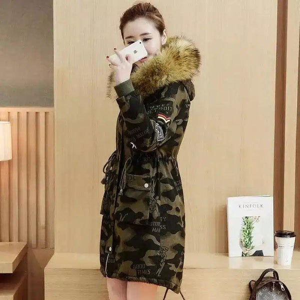 Tykk bomullsvattert jakke, hårkrage for kvinner vinter