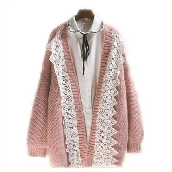 Strikket cardigan med blondekant og bluse med bindebånd i halsen