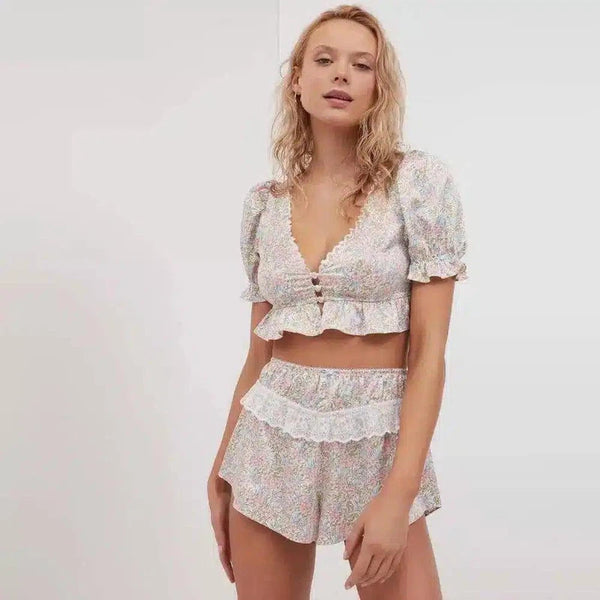 Blomstret Crop Top og shorts-sett med volanger for kvinner