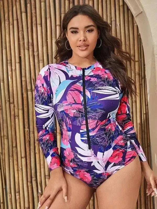 Badedrakt i én del for damer i plussstørrelse, langermet med trykk