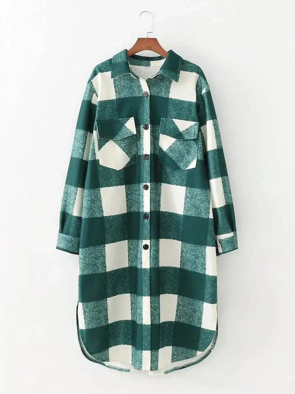 - Designdetaljer: Fet grønt og hvitt rutete mønster, to brystlommer med klaff, knappelukking foran