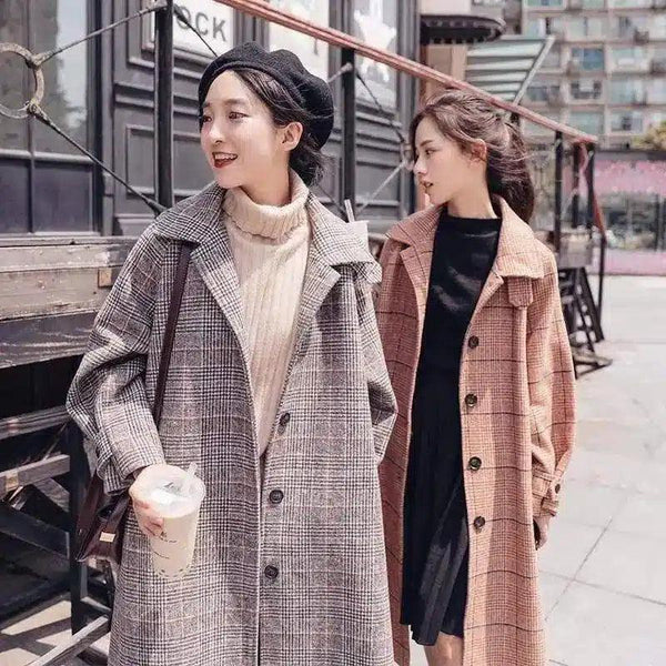 Rutete ullfrakk kvinnelig lang seksjon koreansk versjon vinter
