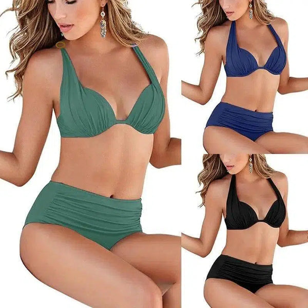 Bøylebikini med volanger og bøyler, ensfarget badedrakt med høy reinshøyde