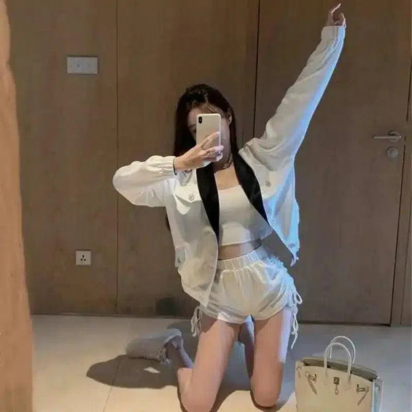 - Passform eller stretch: Shorts med justerbar snøring i midjen; løst sittende jakke