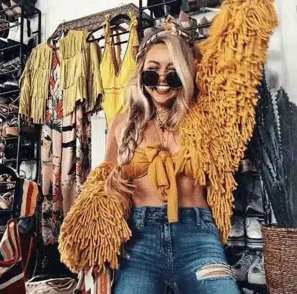 - type plagg Plaggtype: Cardigan med frynser og crop top med slips foran