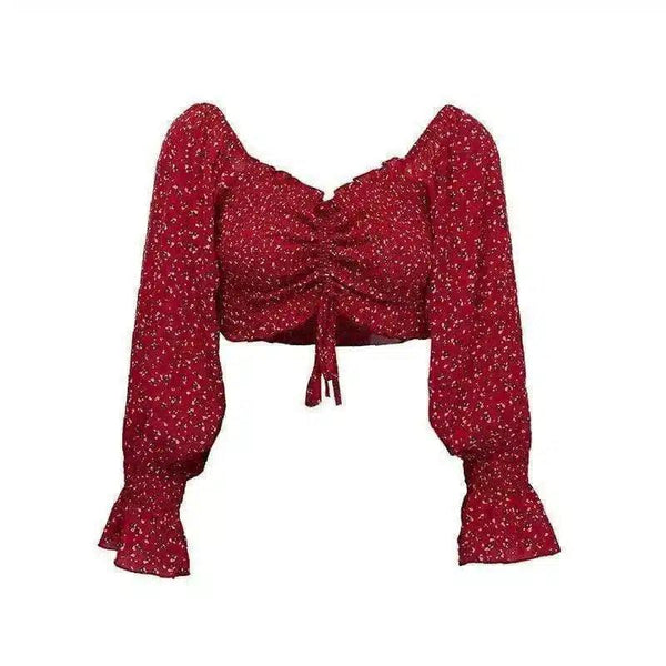 Blomstret Crop Top med lange ermer og bindebånd foran