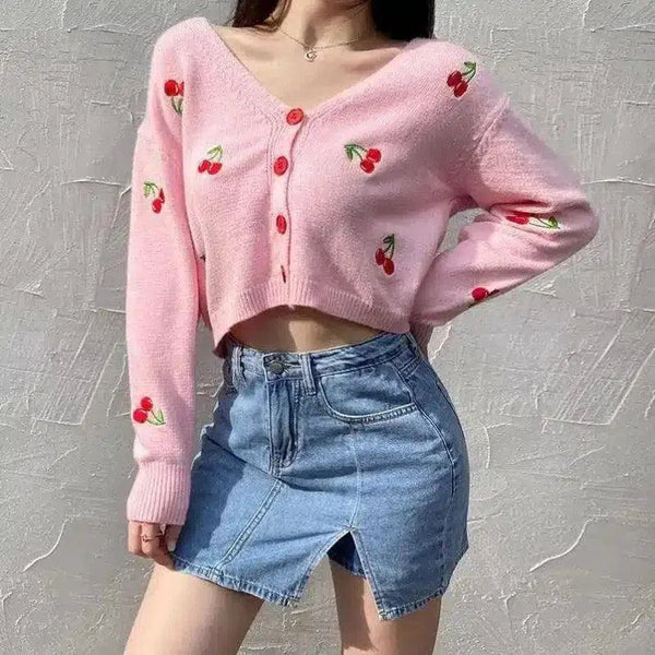 Kirsebærbrodert Crop Cardigan med knappelukking foran