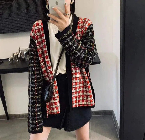 - Intensivt mønster Innsiktsfullt mønsterdesign: Blazeren har et klassisk houndstooth-mønster i rødt og svart, ispedd subtile metalltråder som gir et snev av glitter og glamour.