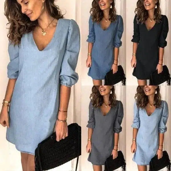 Kortermet, uformell kjole i bomull og lin med V-hals og korte ermer