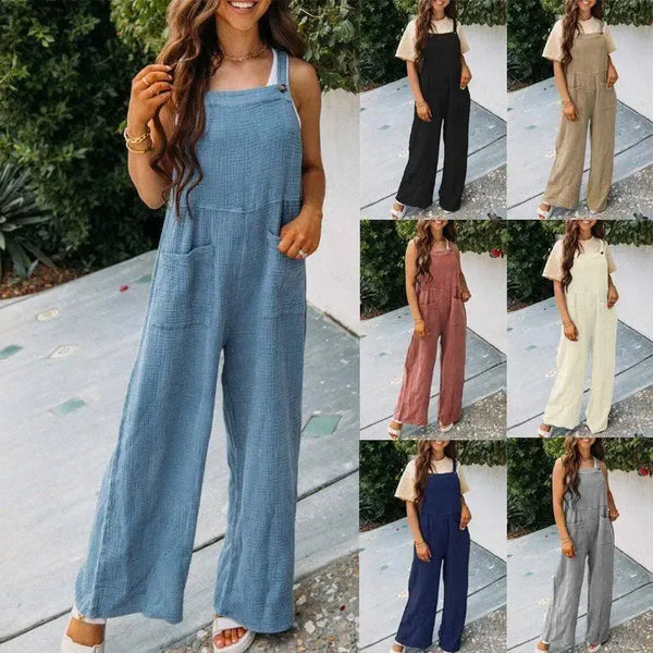Jumpsuit med lommer, firkantet hals, vår sommer, uformell, ensfarget, løs kjeledress, dameklær