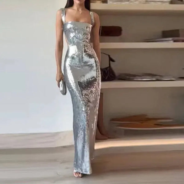 Paljett Sling Square Collar Backless Dress Kjole Kjole Skjørt