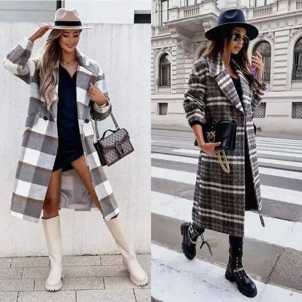 Rutemønstret midtlengde frakk med revers og slips i ull