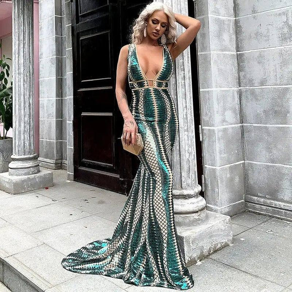 Produktbeskrivelse: Suspender lang hale uregelmessig stripete kveldskjole