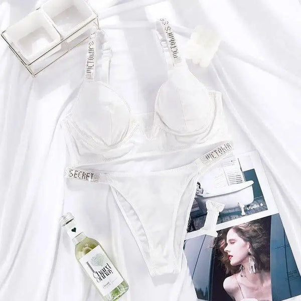 Produktbeskrivelse: Push Up Deep V Letter Rhinestones Bra Set Women