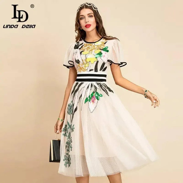 LD LINDA DELLA New 2021 Women Summer Fashion Runway Midi Dress Butterfly Sleeve Sequined Embroidery Ladies Slim A-Line Kjoler