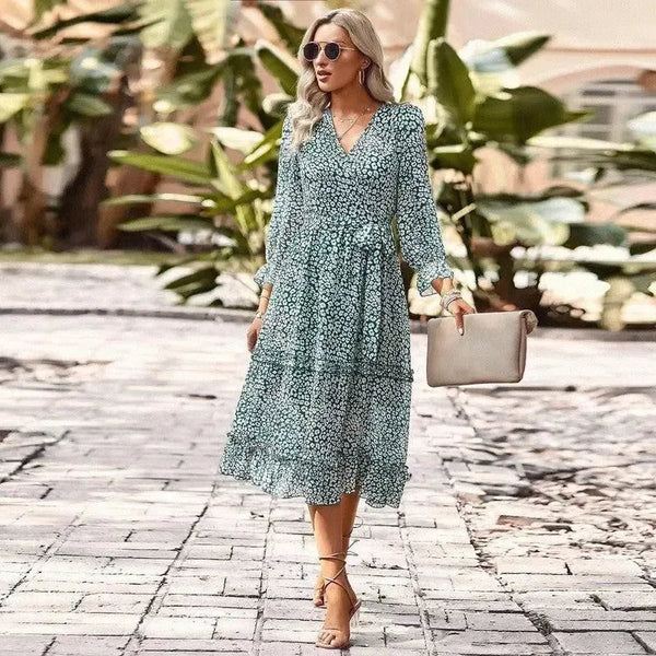 Temperamentfull, elegant V-hals med 34 ermer og bindeskulder med blomster